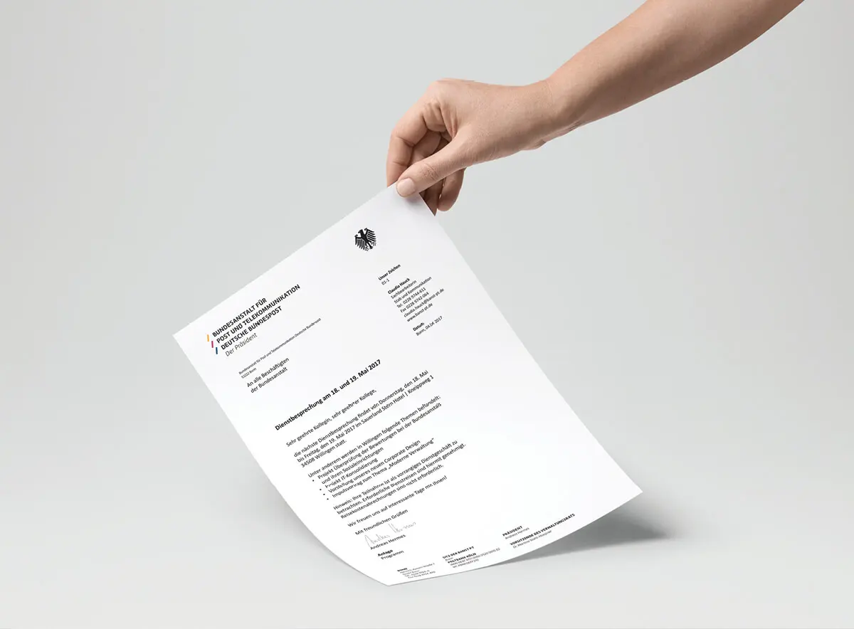 Behörden stehen heute vor neuen Aufgaben und Anforderungen. Für die Bundesanstalt für Post und Telekommunikation bedeutete dies: Das Selbstverständnis als moderner Dienstleister sollte sich auch in einem zeitgemäßen, identitätsstiftenden Auftritt nach innen und außen widerspiegeln.